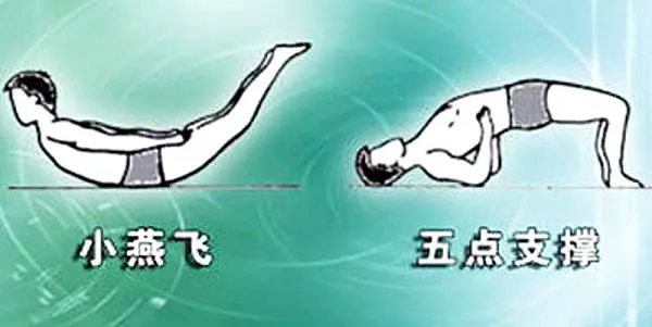 “小燕飞”:仰卧去枕,双手背后,用力挺胸抬头,使头胸离开床面,同时膝关节伸直,两大腿用力向后离开床面,持续3-5秒,然后肌肉放松3-5秒,再重复。