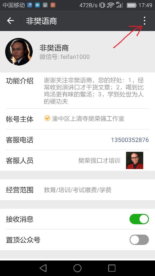 第八步:点击【非樊语商】微信公众号右上角。如下图